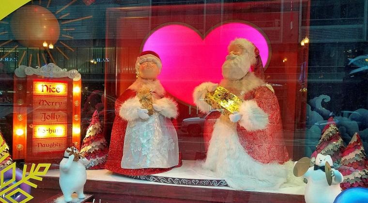 This is one of the window displays at Macy’s this holiday season. It is such an adorable display! The heart behind Santa and Mrs. Claus changes color, while the light box to the left displays very important information; that is, has someone been Naughty, Nice, Merry, Jolly, or Ho-Hum. I find that last one rather interesting! I’d hate to be considered “Ho-Hum” on Santa’s list!