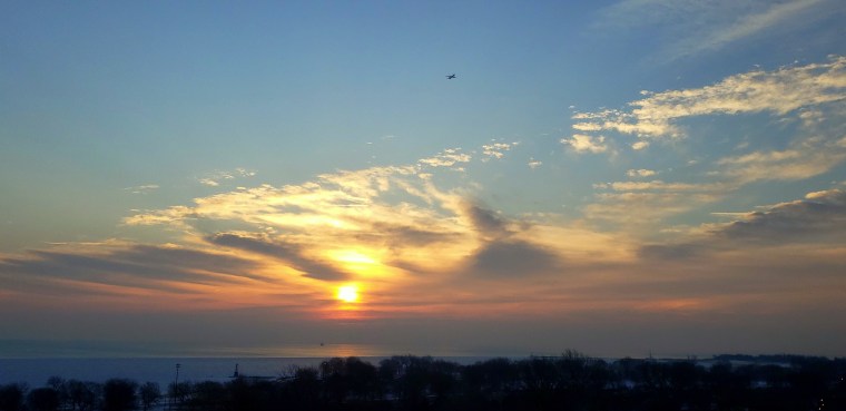 Well this was a lovely sunrise this morning! What’s interesting to me is that Lake Michigan appears to have two horizon lines.  I noticed this as soon as I looked out of the window this morning.  It was almost as if part of Lake Michigan was still covered in a layer of ice, and part of it wasn’t.  I don’t think that was actually the case; however, I don’t have an explanation for this interesting illusion.