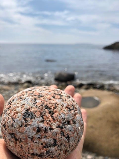 Acadia National Park includes areas comprised of pink granite. This photo shows a huge chunk of it by the water’s edge. You can see how large it is, as it almost takes up Janet’s entire hand!