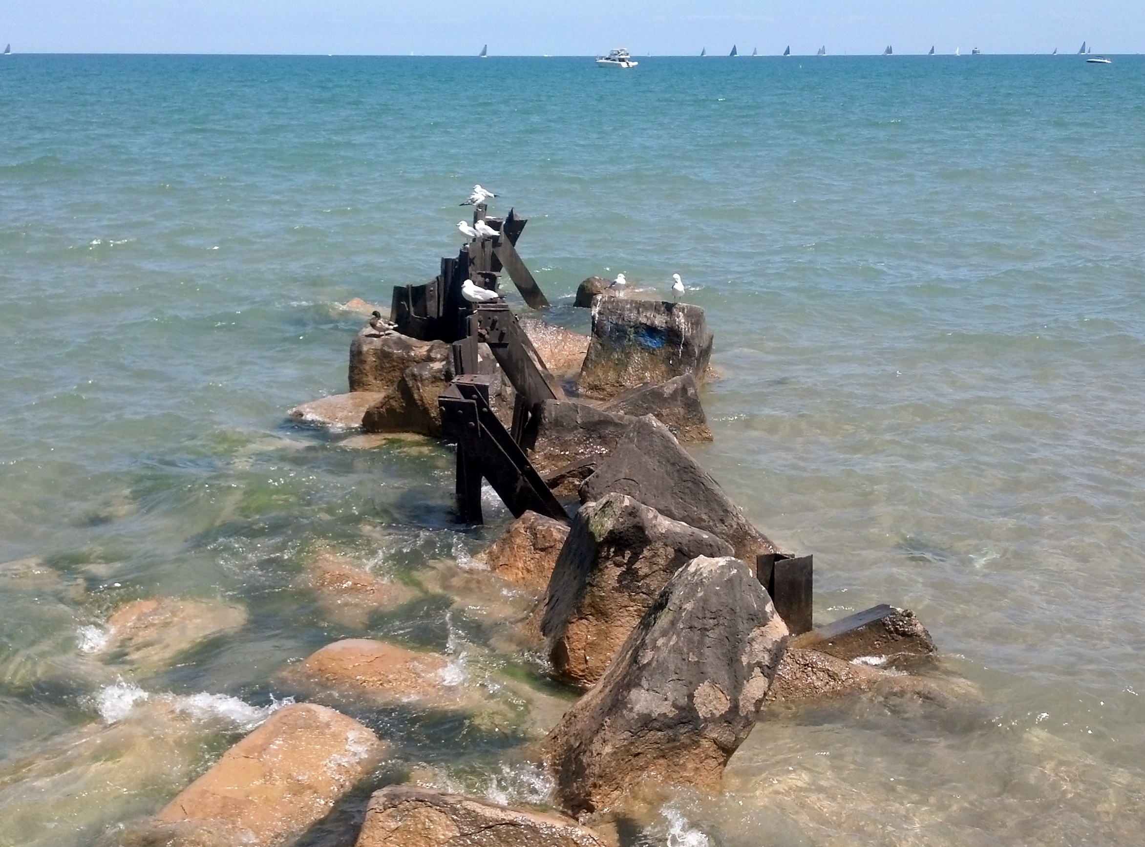 I suppose flying over Lake Michigan can become rather monotonous at times.  And look, there’s room for everyone!  The water is very clear, isn’t it?  While sailboats seamlessly glide out on the horizon, this colony of fowl weathered friends seem rather content to perch and ponder.  Pssssttt……..Has anyone bothered to tell these sea-faring creatures they are gathering on one of the Great Lakes, and not an ocean?  I won’t tell if you don’t.  We wouldn’t want to unnecessarily ruffle any feathers now, would we?