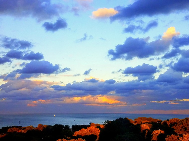 Oh how I love this photo! I took this pic last July just as dusk was approaching.Β You can see a solitary sailboat gliding over Lake Michigan.Β There is also a plane heading to O’Hare Airport here in Chicago.Β In the foreground the setting sun is randomly (or at least, it seems random) lighting parts of the trees.