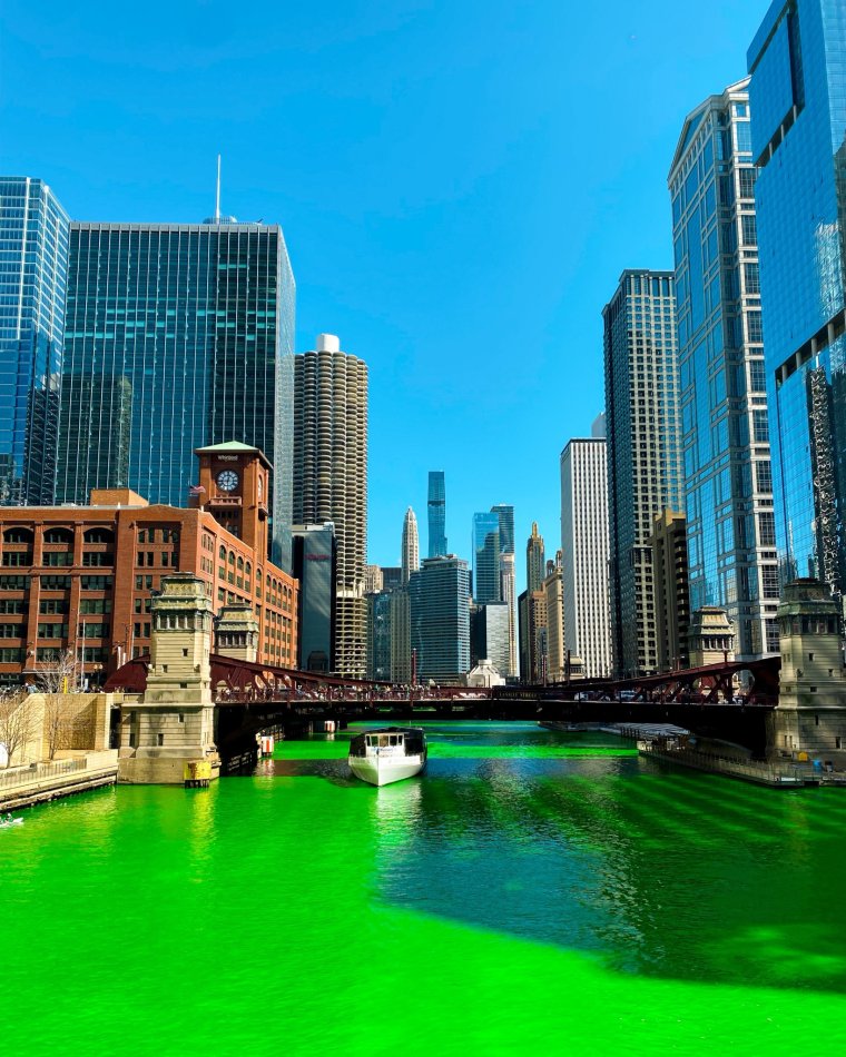 On March 16, 2024, the Chicago Plumbers Union Local 130 again had the honor of bestowing the Chicago River with its neon green color since 1962. A vegetable dye is used to create this incredible sight: