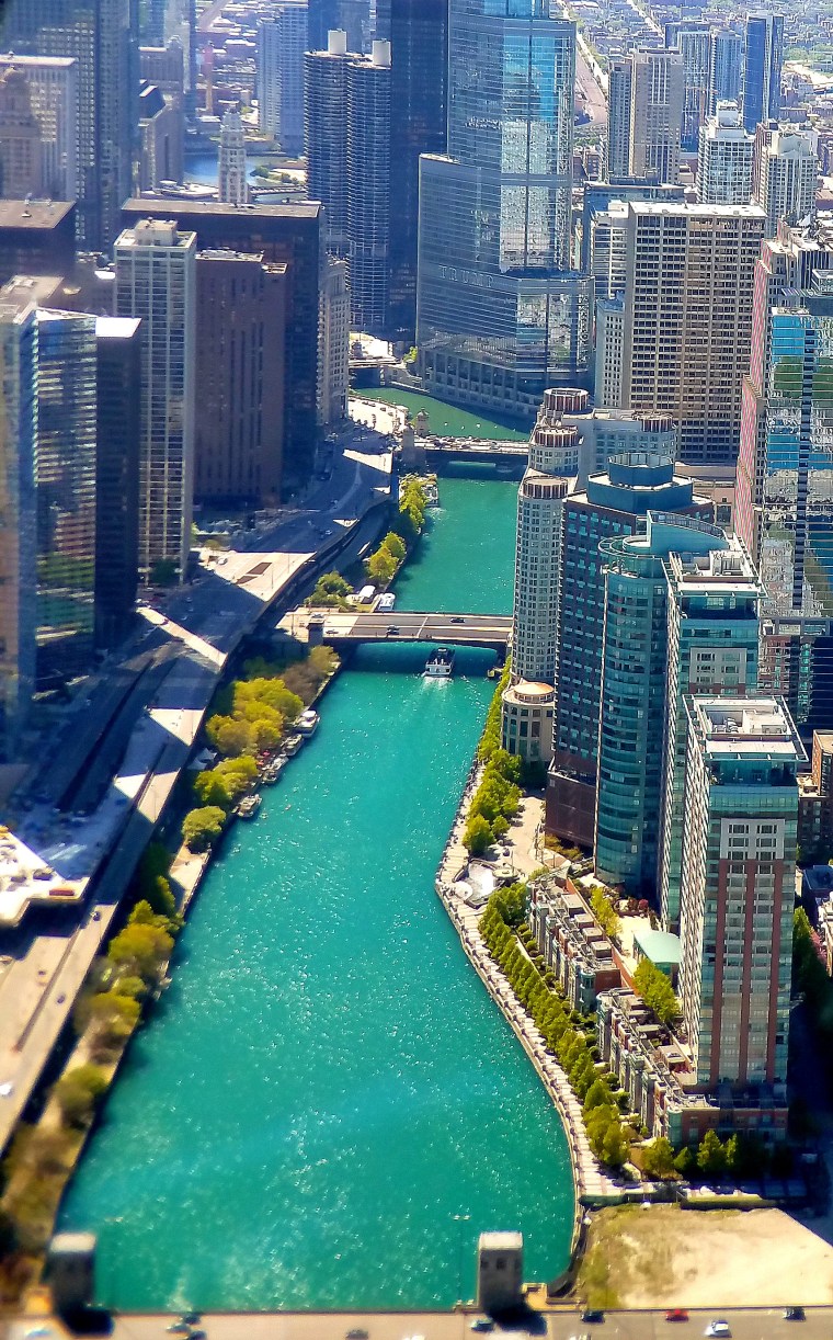 Part 2 and Part 3) but with a ‘zoomed’ perspective. This is the Chicago River, meandering its way through downtown Chicago. Despite the fact we were high above Lake Michigan, I like this zoom-in look because it gives you a little bit more detail of the buildings along the river.