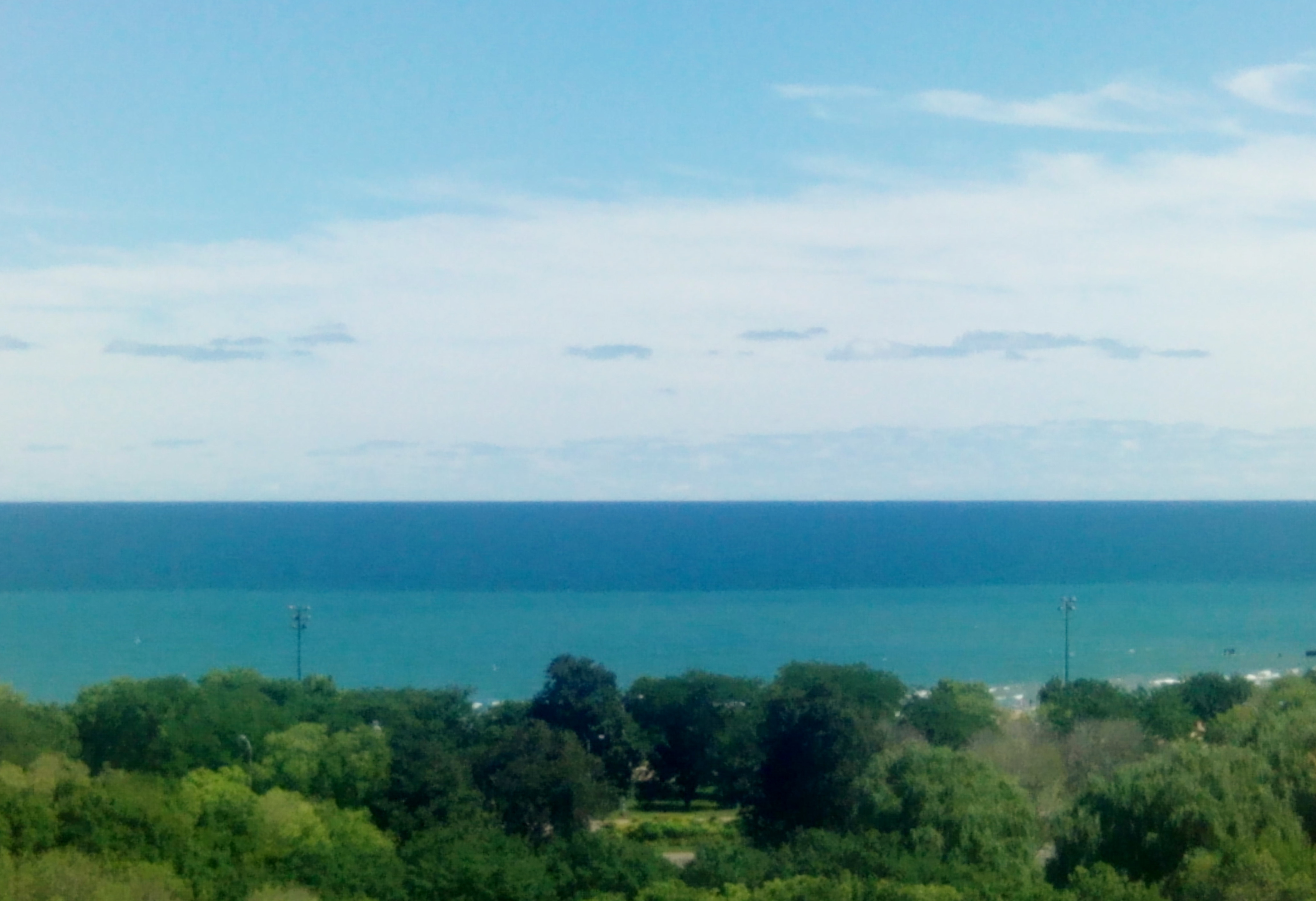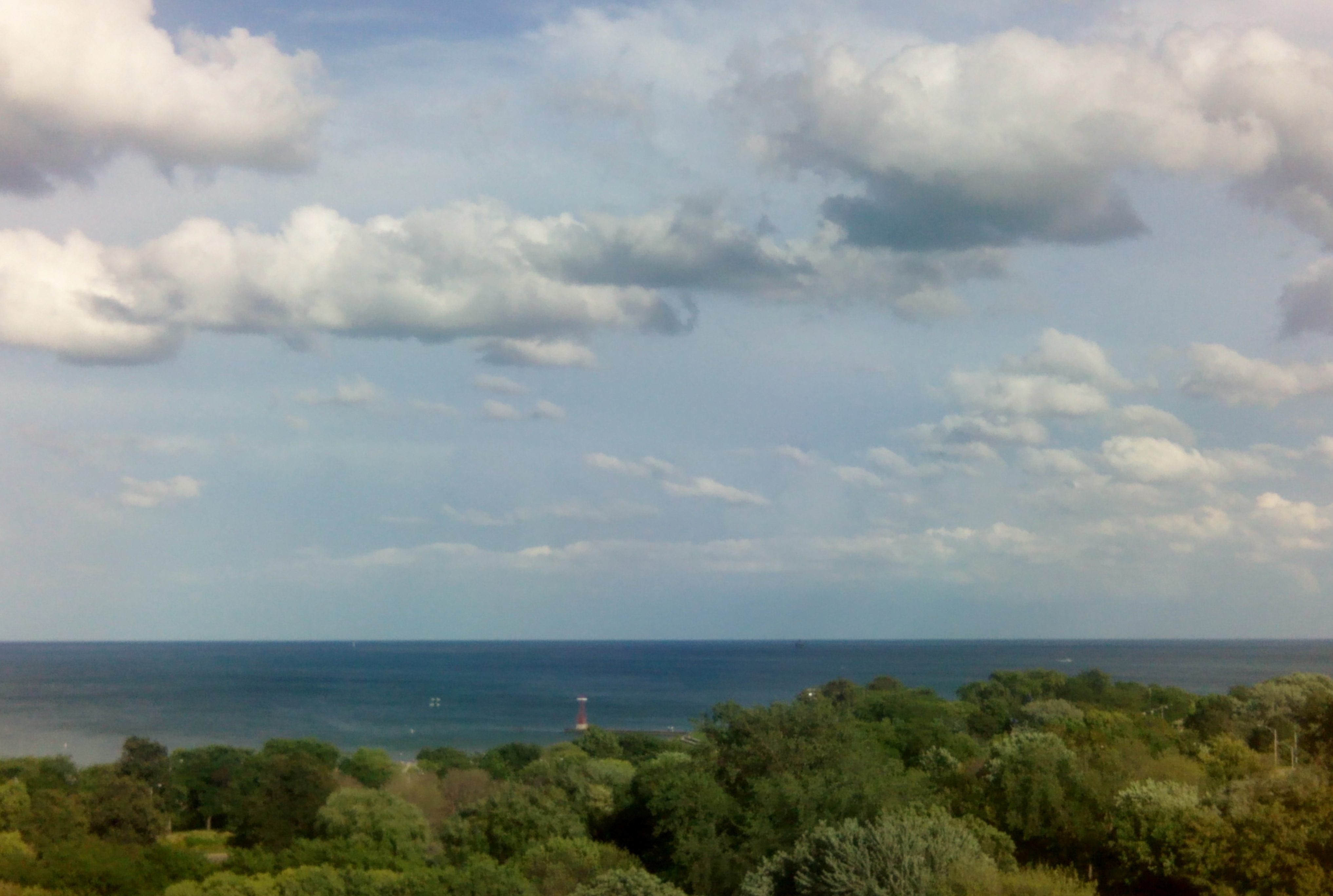 It may seem that I’m doing a ‘repeat performance’, as it were, from last Saturday’s post; that is, showing you yet more photos of Lake Michigan. However, what continues to intrigue me is the awe-inspiring and entrancing way in which this lake shows its never-ending beauty. The above photo was taken today; the water is fairly calm, and there are only tufts of clouds looming overhead. My, what a difference a day makes: