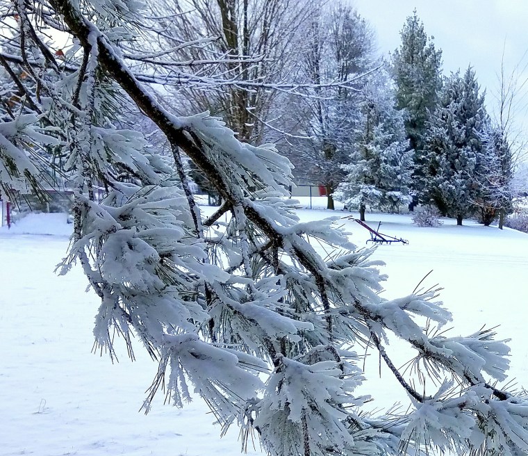 There is just something so pleasing to the eye when snow falls upon the branches of a pine tree!Β This is another picture I took this past Christmas while in Ontario (Canada).Β Waiting on Spring, this scene is a calm reminder of winter’s beauty.