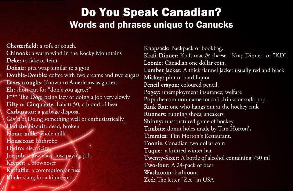 Let’s see if you can incorporate a few of the Canadian words and phrases into a conversation with someone (Canadians need not apply; you’ve already been, “Giv’n’r” eh).