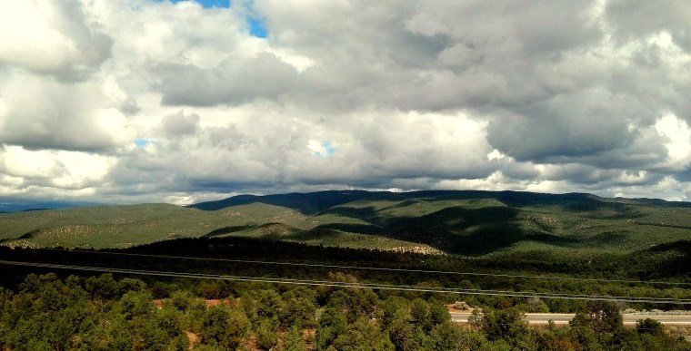 It’s hard for me to believe that I took this photo over a year and a half ago on the train from Chicago to California.Β This was ‘somewhere’ in New Mexico; I remember seeing this magnificent view and all I could think about was how incredibly low the clouds appeared.Β I have never seen clouds this close to the ground before!Β It was as if you could run up the hill and touch them!