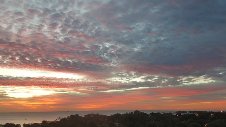 Another reason (not that I needed one) about loving October, is the incredible sunrises that hover over Lake Michigan here in Chicago.Β It appears the sky painter was thinking about cozy fireplaces, warm thoughts, and robust coffee (okay, that last one was actually my thoughts at the moment as I drink my large mug of coffee).