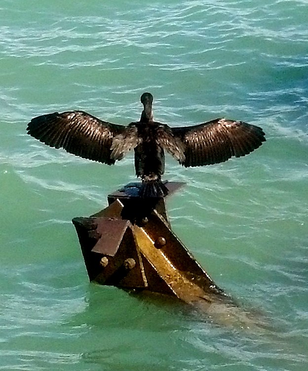I had to ‘google’ his features to try to find out who he is! It turns out this is a, “Double-crested Cormorant. Apparently they are native to North America, live in coastal areas and fresh-water lakes. Why I have never seen one I do not know. Interestingly enough, this bird does not have fully waterproof feathers. Although this particular fellow decided to ‘fend off’ the seagulls by spreading his wings, they also do this for long periods of time to ‘dry out’ their wings. I think that is why he didn’t fly away when besieged with seagull ‘snipers’.