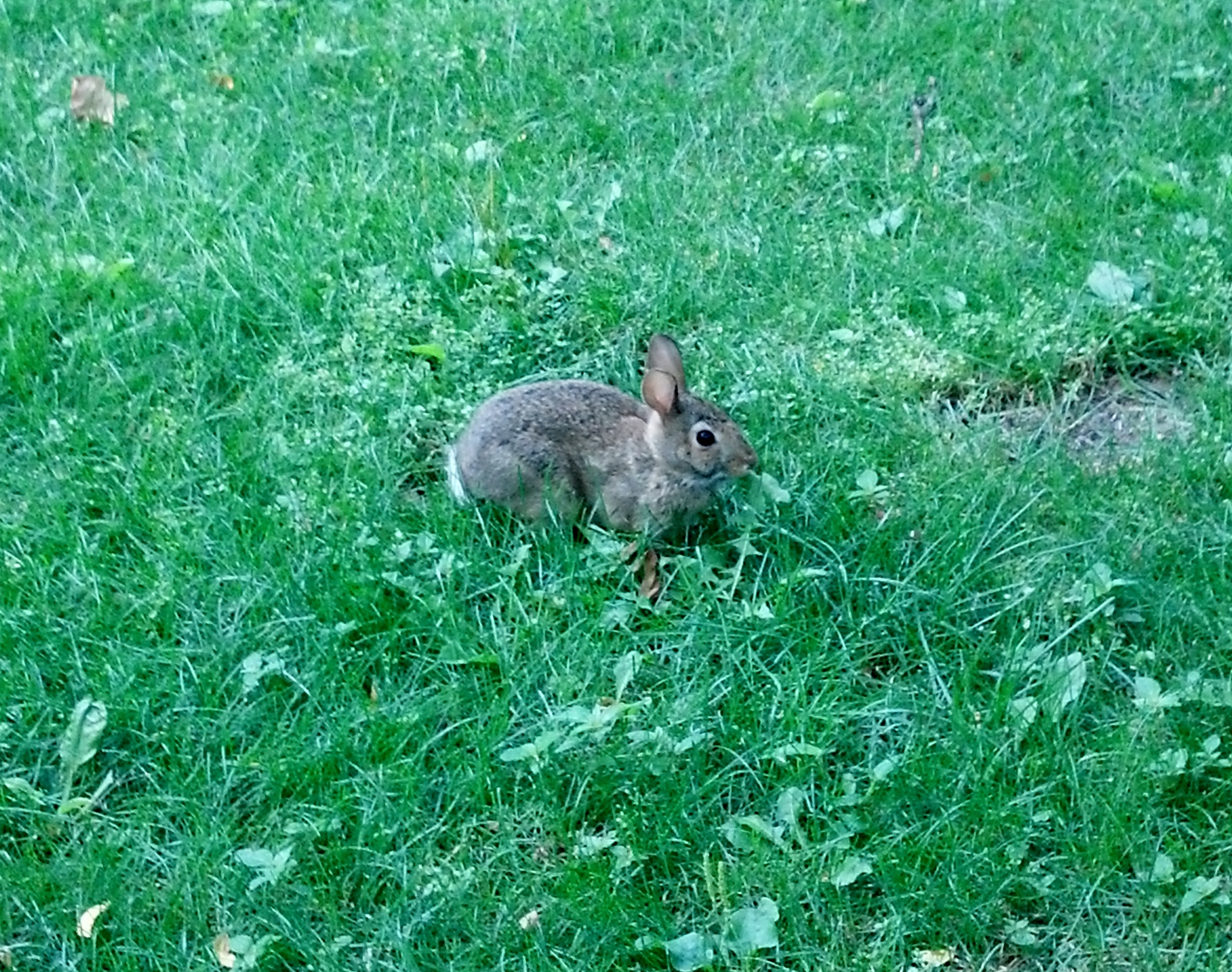 Talk about a wonderful treat! I saw this dear little bunny today.Β  It is very unusual to see rabbits and bunnies in the city; in my experience at least.Β  And wouldn’t you know, one of those pesky squirrels was ready to chase him when all of a sudden I looked at that squirrel and said, “Oy! Leave that bunny alone!” I know that sounds silly, but for some reason it worked! The bunny didn’t run away (I should have thought about that before scolding the squirrel!) and enjoyed his snack while I snapped a photo.Β  All the while I was grinning from ear to ear!