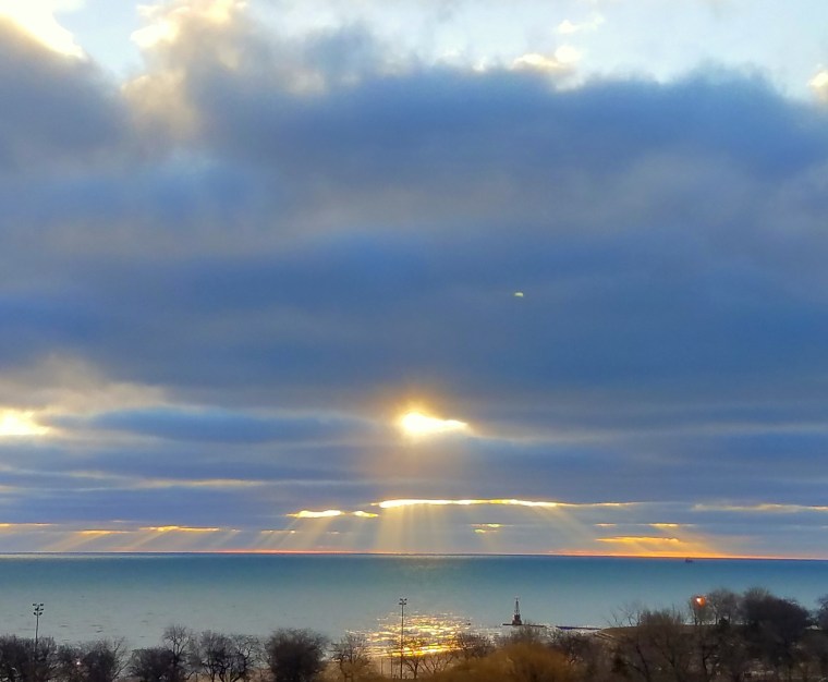 Do you see the sun rays beaming down onto Lake Michigan? It’s almost as if the sun poked very specific holes in the clouds to allow the sunlight to create a lovely ‘showering’ effect. Why, even a bit of the shoreline appears to be basking in golden tones.