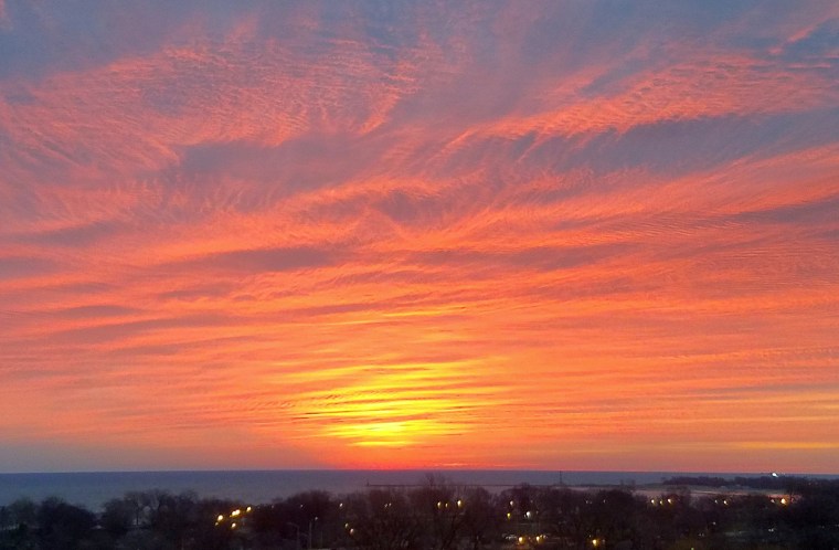 It’s been quite cloudy here in Chicago lately, so I haven’t had the privilege of capturing a colorful sky for a while.Β However, that changed this morning when I looked out the window! Lots of layered clouds with the sun’s early morning light making its entrance through the pink and orange wispy clouds.