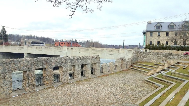 I wrote a post last week about my charming little hometown in Canada:Β Meandering Grand River, Southern Ontario, and how the stone structures of an era long ago are still incorporated into the landscape. Today’s post is another photo showing more original stonework.