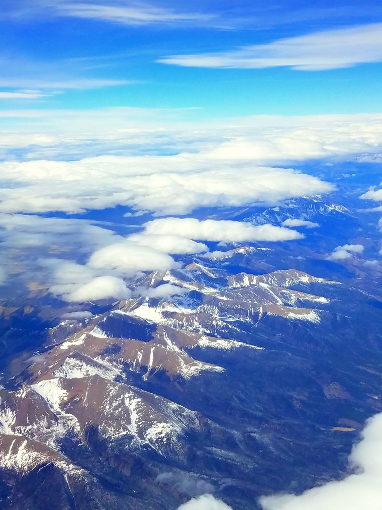 On the way to Los Angeles a week and a half ago, I snapped a few pics of the incredible scenery outside of the airplane window.Β  With the clouds rolling quickly by I was able to get some good shots of (I think?) the Rocky Mountains below.Β  To me, the sprinkling of snow looks like powdered sugar!