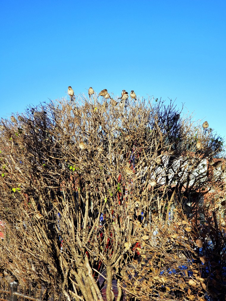 Case in point: As I approached the area near the bushes (photo above), I could hear a mammoth chirp-session that sounded as if dozens of birds were having quite the chat (if you look closely, you will see lots of birds in the bushes).
